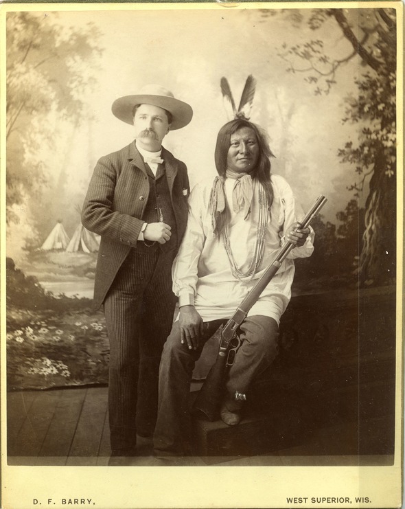 LIBI_00019_00203; This item is a card-mounted albumen photograph (studio portrait) of Rain-in-the-Face and David F. Barry in full view. The imperial view photograph is 7 7/8 x 10" mounted and was produced circa 1880 by David F. Barry. The photographer's stamp is embossed in brown and gold ink on the front. On the verso, a handwritten notation in black ink reads, "To Mrs. Geo. A. Custer/Compliments/D. F. Barry." Another handwritten notation on the verso reads, "Rain in the Face."Note: "Pkg 1/Custer Chest" handwritten on the verso.; PRINT, PHOTOGRAPHIC [Mounted on card]; Courtesy of the National Park Service, Little Bighorn Battlefield National Monument, LIBI_00019_00203, D. F. Barry, "Rain in the Face and D. F. Barry, in Full View," circa 1880