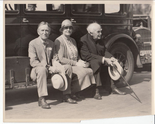 Harvey Firestone, Mina Edison, and Thomas Edison sitting on an automobile running board..