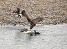 Two bald eagles fighting for bison carcass