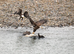 An eagle chases another eagle off of a bison carcass which is in water