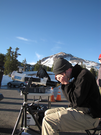 Viewing eclipse through a special scope, Lassen Peak in backsground