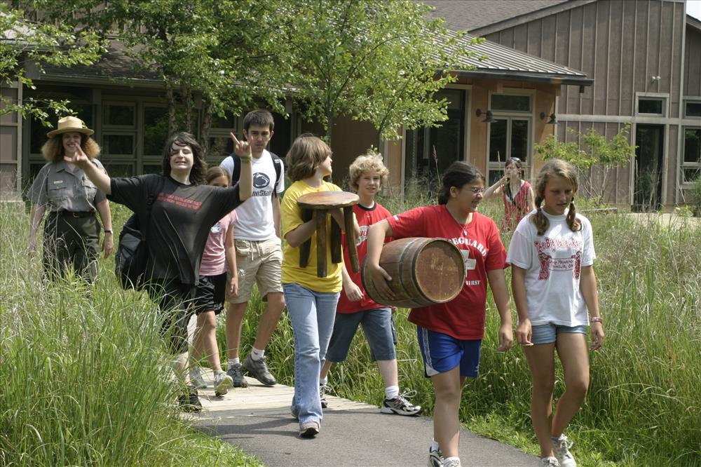 Since the mid-1990s, Cuyahoga Valley Environmental Education Center has offered a variety of summer residential camps. River Run - Theatre: "Fantasy in the Forest" is provided in partnership with Magical Theatre Company. Children entering grades 5-10 work with professional faculty to develop their performing arts skills in acting, voice, movement, and stage combat. The short performances are outdoors and integrate into the natural setting of the CVEEC campus. || Campers walk outside November Lodge, the main activities building at CVEEC.