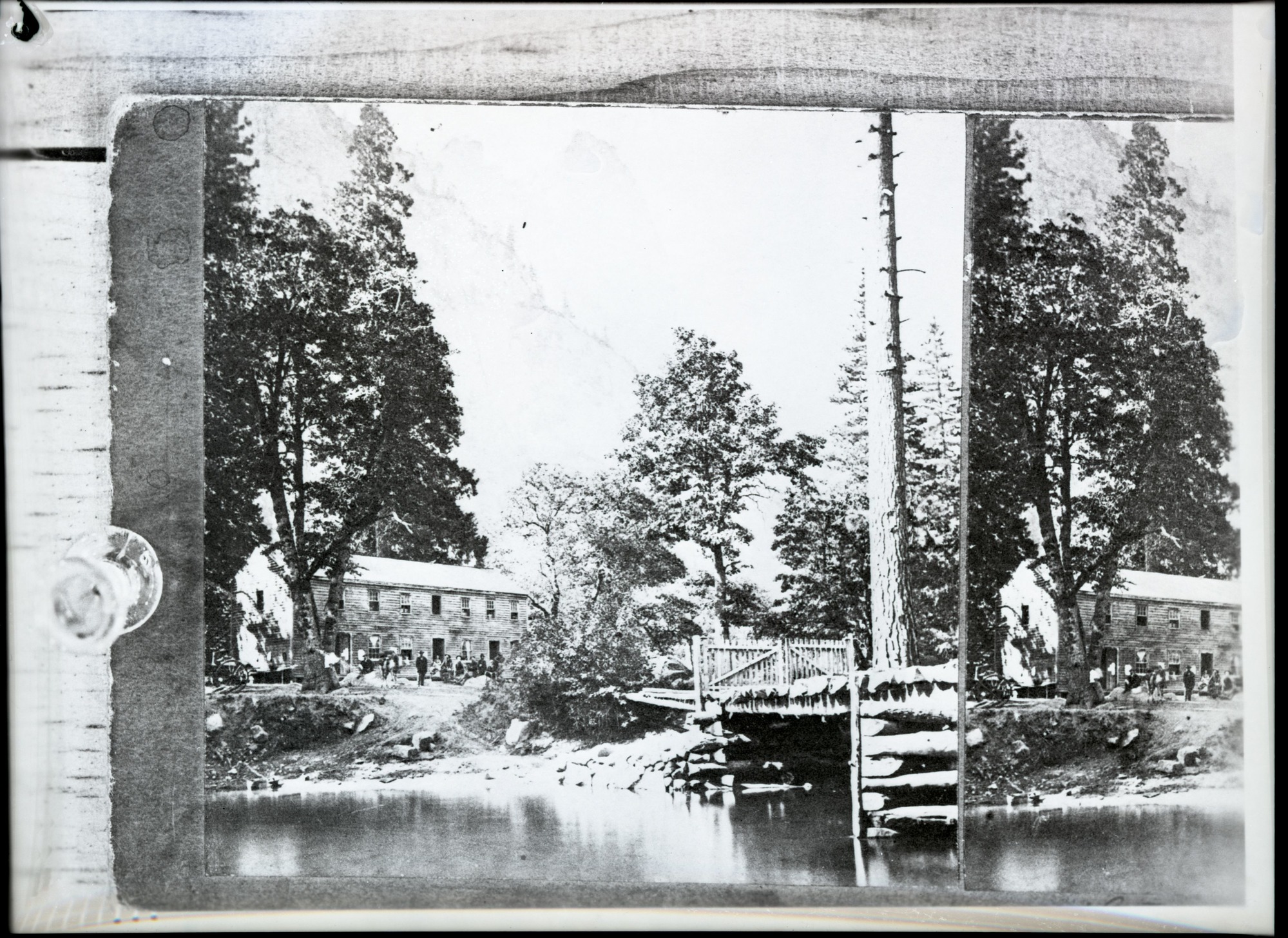 Detail of L. Smaus stereo (RL-16,520). Caption: "109. Hutchin's Hotel and the Merced River." copied by Michael Dixon, copied July 1985