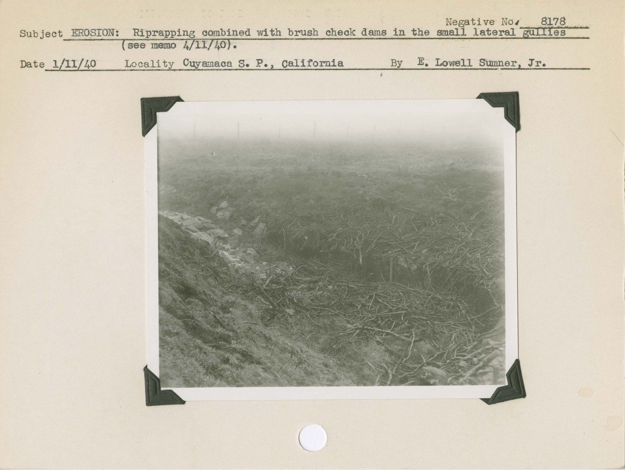Erosion: Riprapping combined with brush check dams in the small lateral gullies (see memo 4/11/40). Locality: Cuyamaca State Park, California. Negative #: 8178