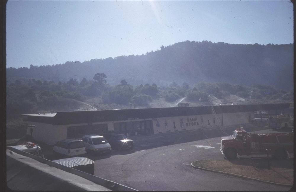 Firefighters provide structural protection to commercial buildings during the Bircher fire, Mesa Verde National Park, July 2000