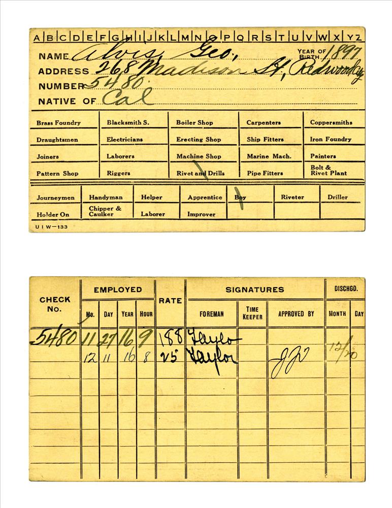 Union Iron Works Co. employee card for George Alvis
