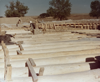 Cottonwood viga beams to form the ceiling of the first floor and the second level deck are in place.