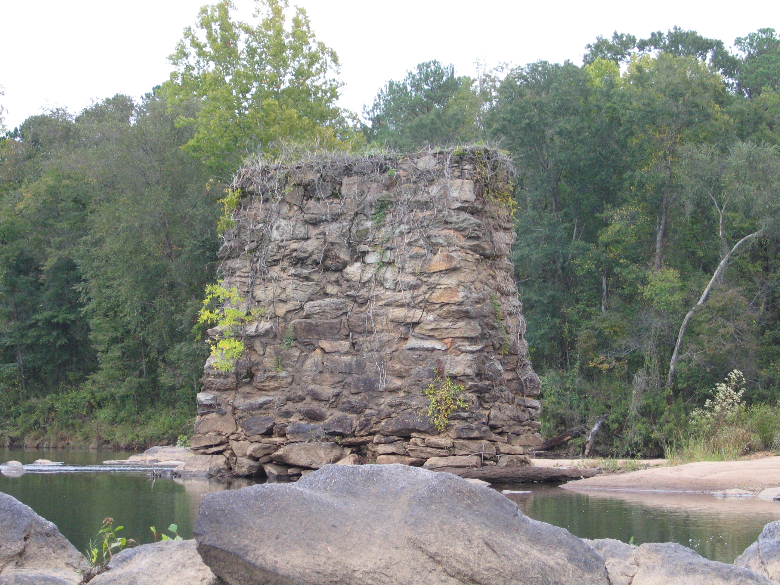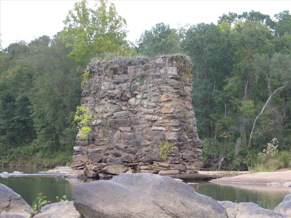 The first fifteen of twenty-one images photographed to document the condition of the remains of Miller Covered Bridge. Park Staff, in a canoe, rowed out in the Tallapoosa to take the pictures of the pillars.
