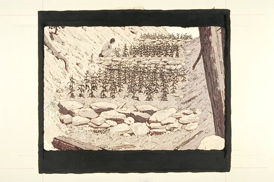 The illustration depicts a Native American Indian tending a corn crop in between a series of check dams. Check dams were made of low stone walls built across shallow drainage areas. The check dams caught soil washed from the mesa tops by heavy summer rains. The moist, fertile terraces formed behind these dams provided ideal locations for planting crops such as corn or maize.