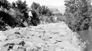 Dike along the Virgin River in Rockville. Homestead on cut bank at left. ; ZION Museum and Archives Image 13636 ; ZION 13636