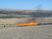Flames leap up in the middle of dry grass prairie. Firefighters stand on two sides of the fire.