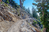 A smooth gravel trails passes along side a steep slope lined by large conifer trees.
