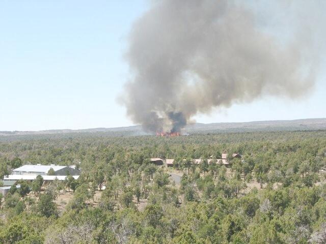 Full fire with black smoke advancing on buildings on the first day of Long Mesa Fire, Mesa Verde National Park, July 29, 2002