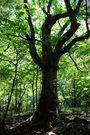 A large, imposing oak tree with outstretched branches covered in bright leaves. Its trunk is covered in moss and has roots that begin above ground.