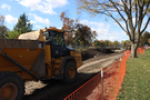 A large yellow dump truck is parked alongside the creek waiting to move into position for its next load. An orange fence runs alongside the rode from the bottom center of the fence into the distance.