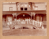 Historic photo of large crew of servants and painters pose on the porch of the Marsh-Billings-Rockefeller mansion