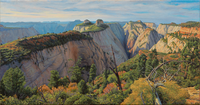 Painting of a series of deep canyons surrounded by cream-colored sandstone covered in vegetation. The plants are various shades of green, orange, and red.