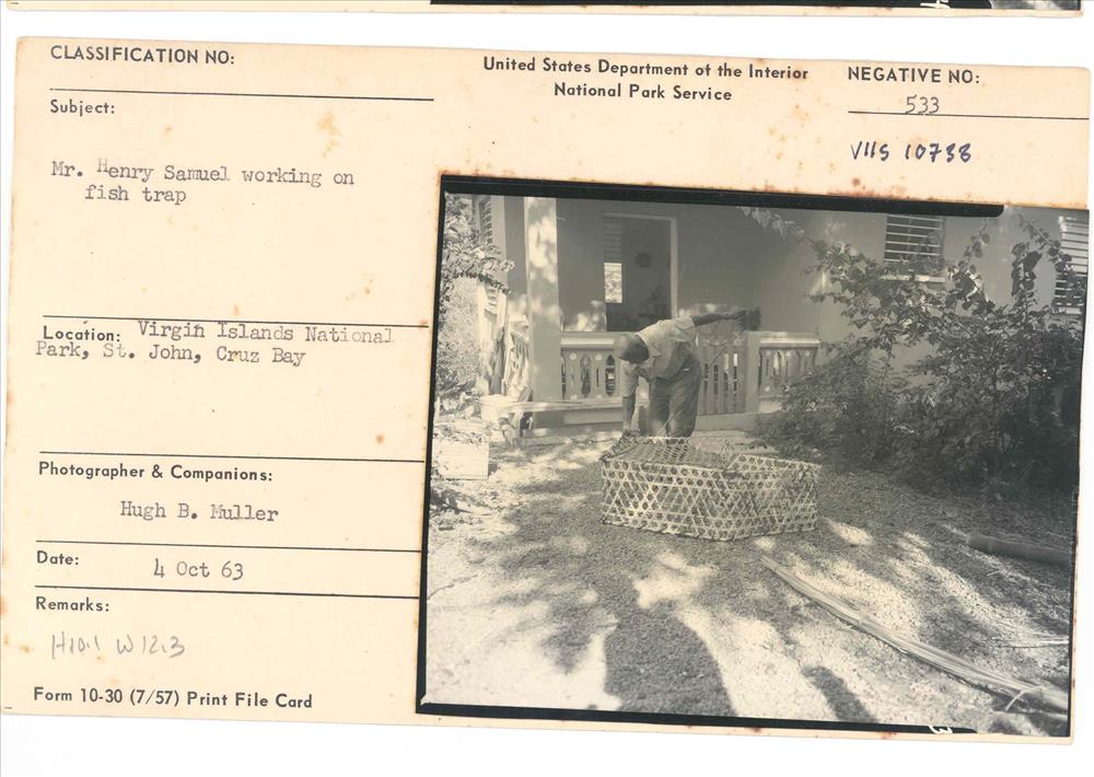 Mr. Henry Samuel demonstrating how to construct a fishtrap made of Teyer Palm, native to the Virgin Islands. His son is watching in image catalogue No. 10736