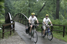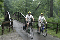 At Cuyahoga Valley National Park volunteers perform a wide variety of duties during every season of the year. Currently over 2,021 volunteers donate over 70,195 hours to the park. || Trailblazer volunteers assist the park by patrolling the Towpath Trail in pairs on bicycle. These volunteers are riding just north of Hunt Farm.