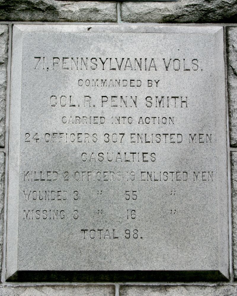 1 of 110 MN to PA. Dedicated 07/03/1886. Indicates position 71st PA Infty held 07/03/1863 at the Angle. Wall breached, LF & center retired to RF position. Located at Angle off Webb Rd. LF 114' S of MN. || Mn & 2 Flank Markers. Mn: fdn 6'1" sq, battered shaft, rough-cut/laid blocks, w/ polished tablets, bronze medallion. Cap cross gable, trefoil. Incised/excised inscrip/detailing. All 10'1"H. Markers: 1'sq x1'6"H. Cleaned, 1985-1987, tablet stained.