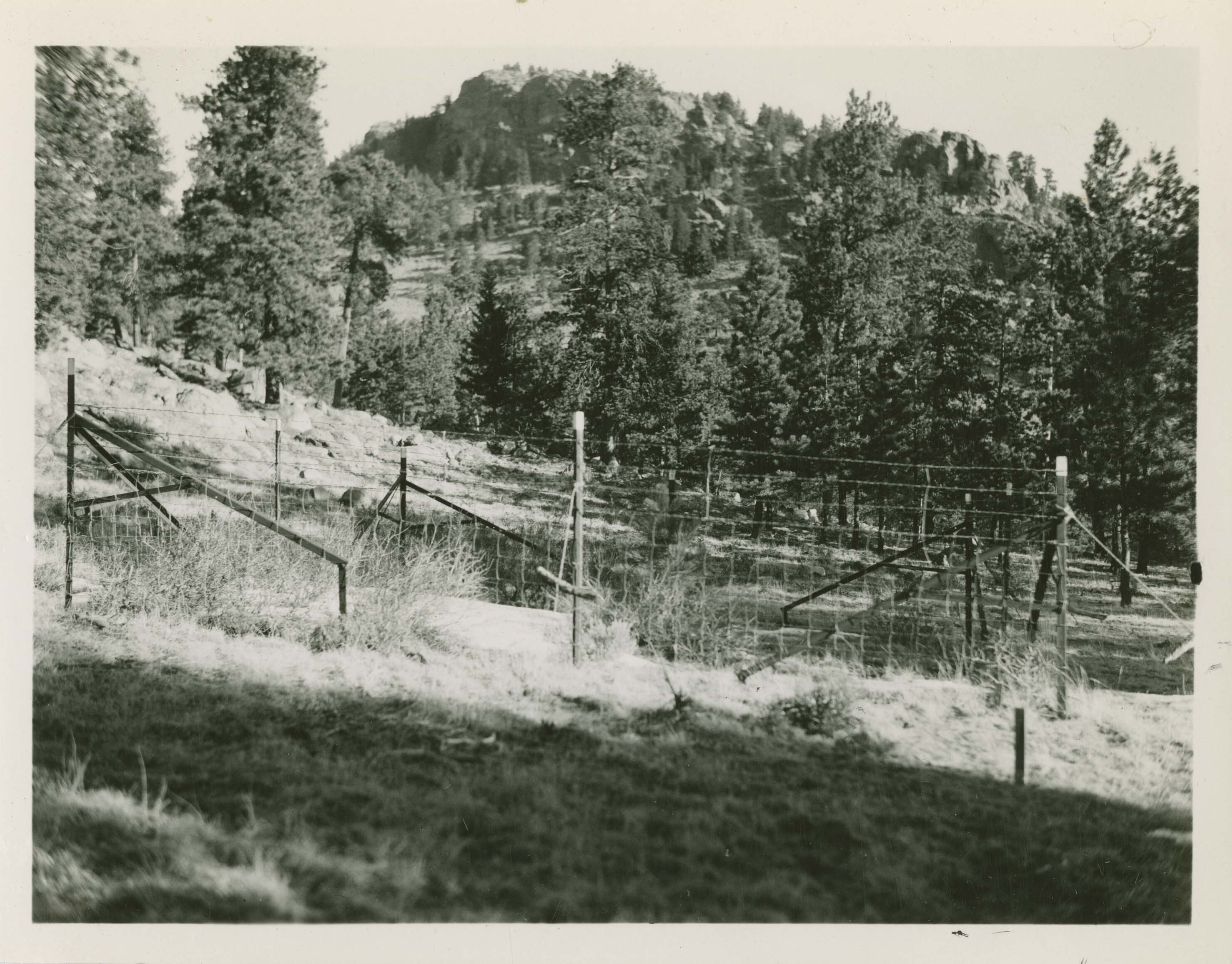 Fenced range study plot #6 in Tuxedo Park. Yellow pine in center; most of woody shrubs are Purshia. Locality: Rocky Mountain National Park. Negative #: 10814