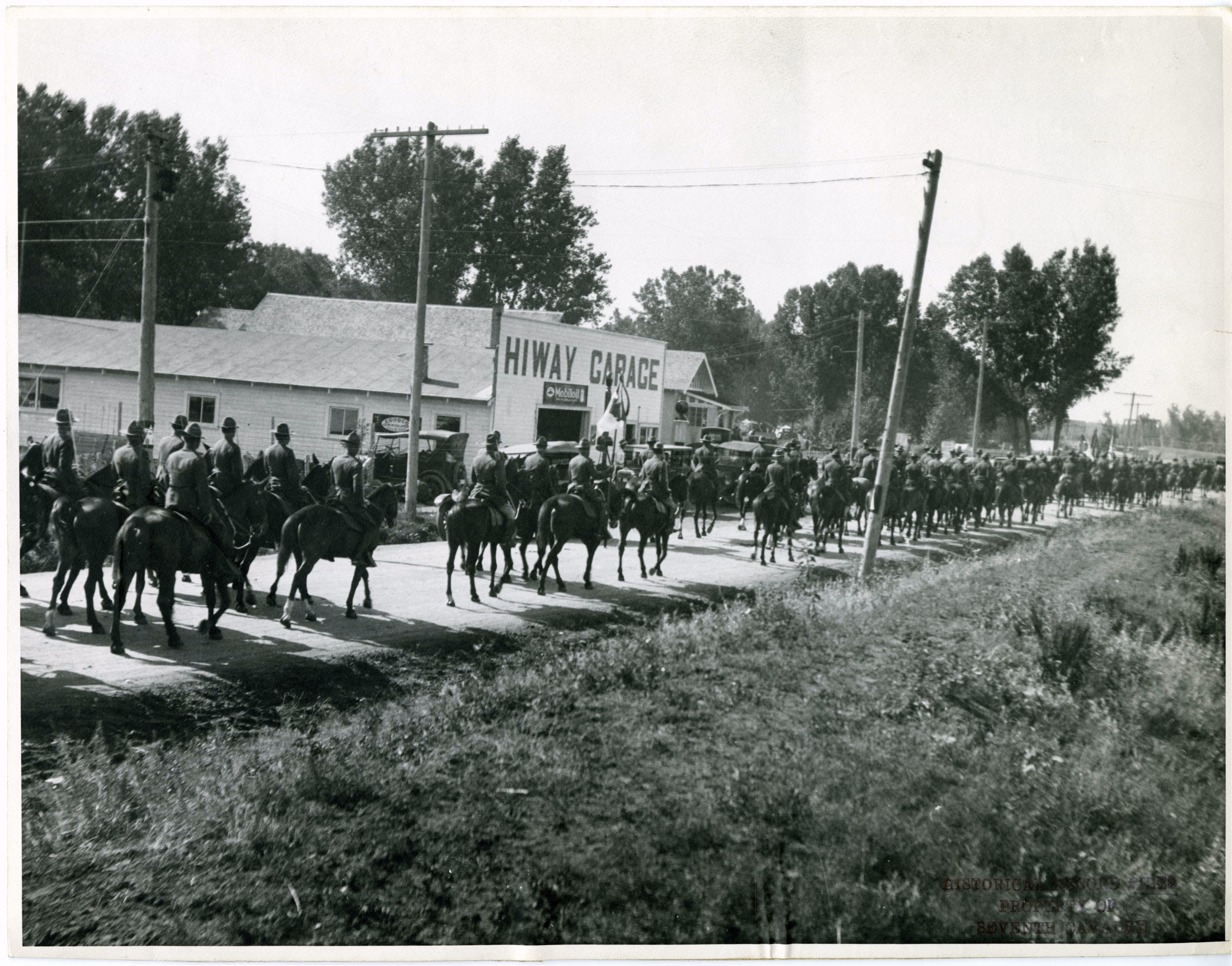 LIBI_00011_07208; A black-and-white photograph (possibly reproduction) 7th cavalry en route from Crow Agency to Garryowen to participate in the unknown soldier ceremonies on the morning of June 25, 1926; handwritten pencil notations on the verso; photograph by E.A. Brininstool. [Note: this print was taken where the Crow Post Office is currently located. An unknown soldier was found in May of 1926, in the Reno Valley area. His remains were held until June, to be incorporated in the 50th anniversary ceremonies. General Godfrey gave a keynote speech during the ceremonies.] ; PRINT, PHOTOGRAPHIC; Courtesy of the National Park Service, Little Bighorn Battlefield National Monument, LIBI_00011_07208, E. A. Brininstool, "7th Cavalry Marching from Crow Agency During the Fiftieth Anniversary Ceremonies," June 25, 1926