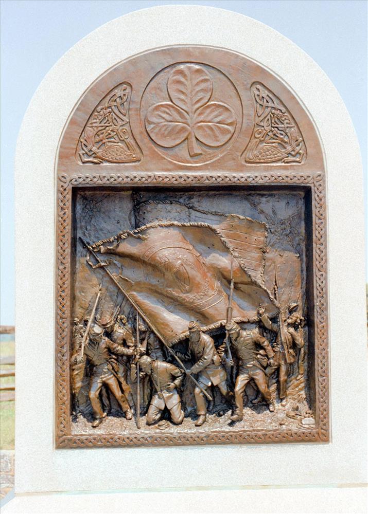 IRISH || Monument consists of large block of County Wicklow (Ireland) granite with rounded top on which is bas-relief panel showing 69th NY color guard in action on front and rondel bas-relief bust of Gen. Meagher on reverse. Adjacent to observation tower. || Built in 1996; sculpted by Ron Tunison