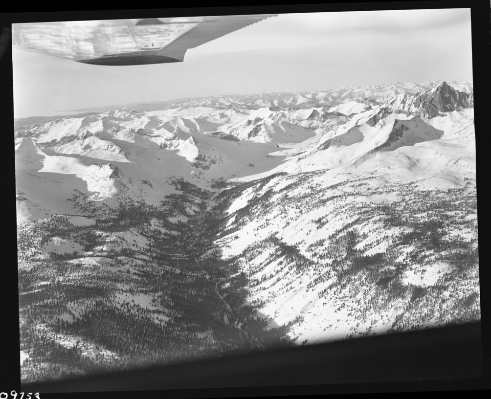 Lorne West, 650100, Ash Peak, SNP, Misc. Canyons, Big Arroyo and Great Western Divide in snow (aerial view).