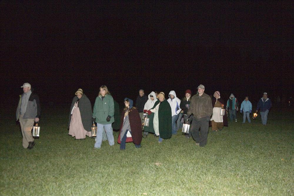 Volunteers, some in costumes and some not, travel by lantern light and practice various scenes. || Cuyahoga Valley National Park interprets Ohio's Underground Railroad heritage because the centerpiece or our park, the Ohio & Erie Canal, was a likely route traveled by runaway slaves. Experience the Underground Railroad, offered each November, places visitors in the role of an escaping slave. The program is part of the National Underground Railway Network to Freedom which recongnizes historic sites, facilities, and programs that have a verifiable association to the Underground Railroad. The photos show volunteers at the dress rehearsal.