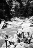 Visitors at the wayside exhibit at the Temple of Sinawava. ; ZION Museum and Archives Image ZION 13429 ; ZION 15933