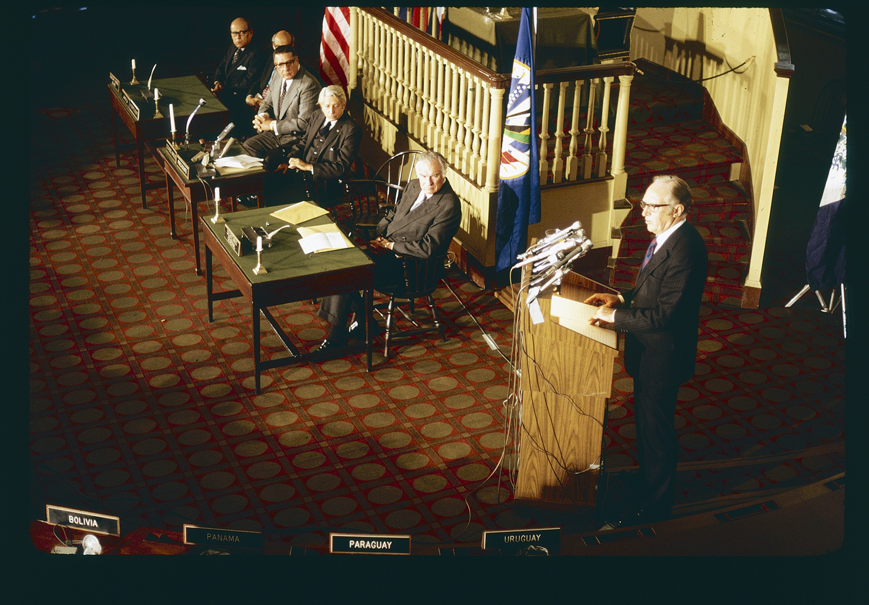 Congress Hall. Interior. 1st floor, House chamber. Looking down southwest. US Secretary of State William P. Rogers visiting Philadelphia and giving address for the 150th anniversary of diplomatic relations between the US and Latin America.