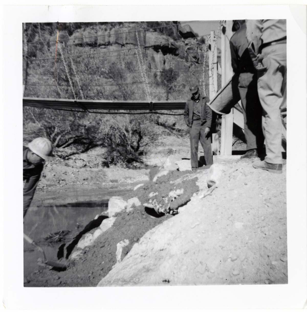 Protection/stabilization of the footings for the old Birch Creek suspension footbridge. ; ZION Museum and Archives Image 005.06.03-2of7 ; ZION 15933