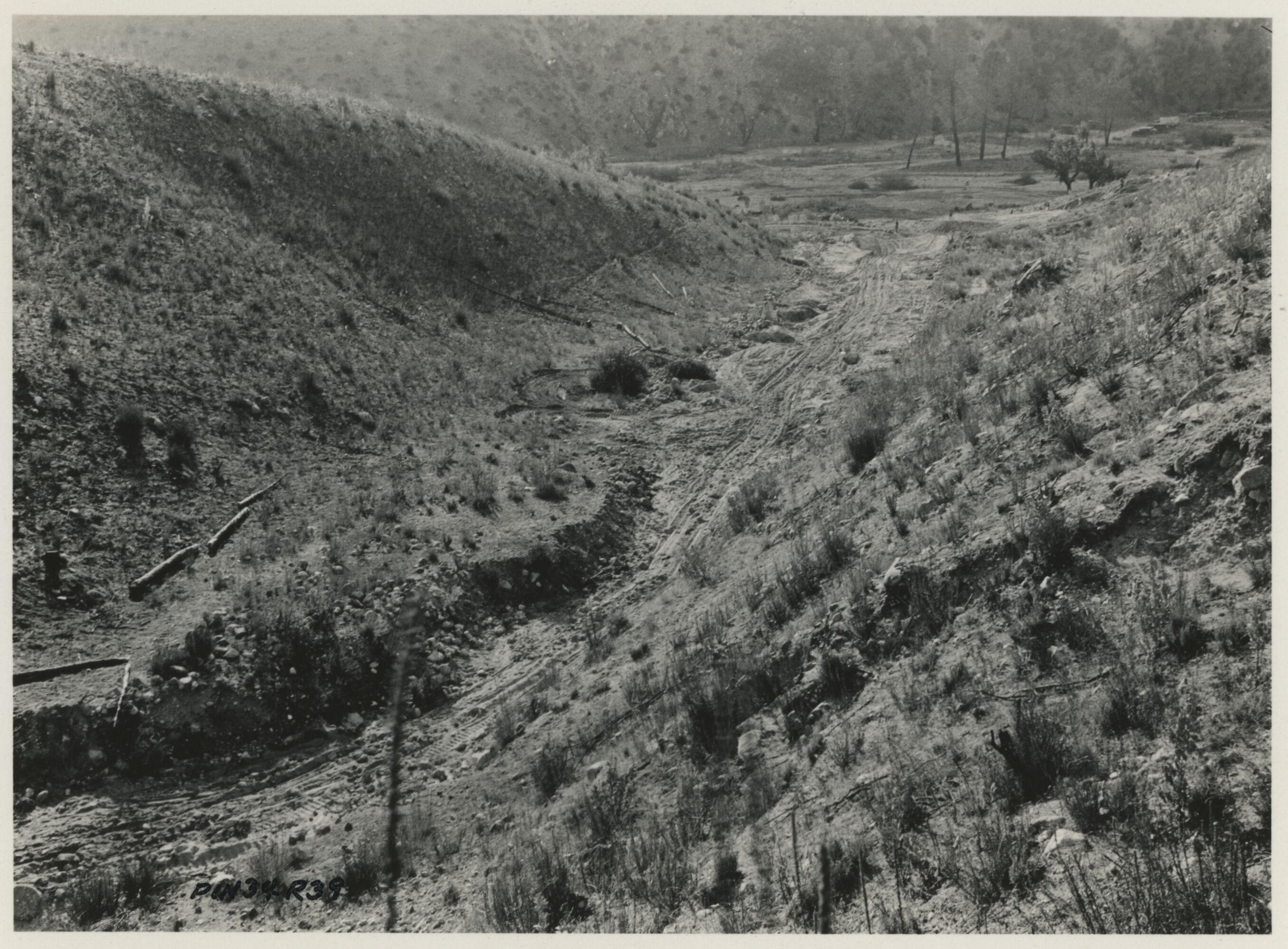 Original ID PIN34R39, "Chalone Creek Road, 400 feet to right of 27+00, looking west, 4'x6" box culvert to be built to care for run-off from this canyon.", 4.25 x 3.25 inches