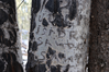 Faint letters historically carved into an aspen tree trunk.