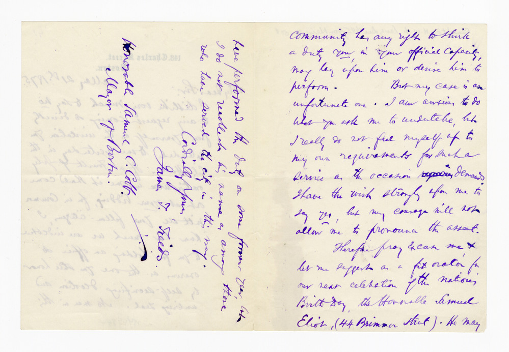 Politely declines request from Boston mayor Samuel C .Cobb to give speech.