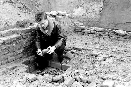 Jamestown Unit B, Sub-unit 76. Showing junior Architect Sloane removing wine bottle discovered in Cache under basement floor of structure 72. Colonial National Historical Park.
