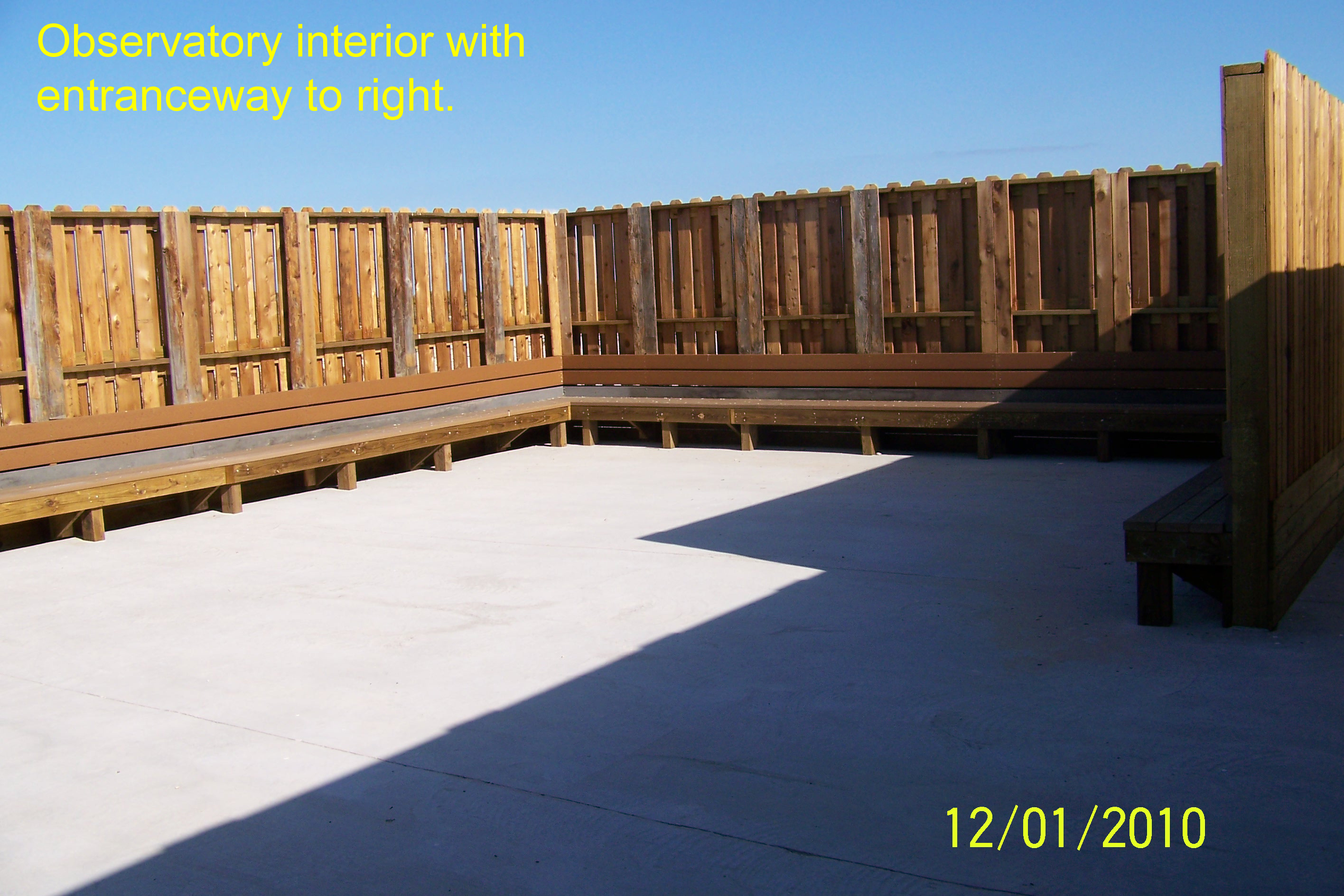 These photos show the recently built Malaquite Observatory. The observatory was built in response to a need to protect the telescopes used by amateur astronomers at star parties held at the park from the elements, which include wind, saline sprary from the nearby Gulf of Mexico, and the glare of headlights of visitors coming to attend the star parties. To combat these problems the park built this observatory, which has (1) a wall/fence made of closely-placed alternating slats to break up the wind (to minimize stress on the structure), but minimizing headlight glare (2) a concrete foundation to provide a steady support for the telescopes (3) benches placed around the inside perimiter for the comfort of people waiting to peer through the telescopes. Minor modifications will soon be made to allow some slats to be removed to allow telescopes to view objects lower than the top of the wall and a white section of the inner wall to act as a screen for slide shows. This facility will also be used during daylight hours as a teaching area for environmental education programs.