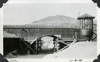 Scotty's Castle Stables detail of east connecting wall construction. October 8, 1928. Photographed by Mat Roy Thompson. Scaffolding inside covered drive and outside. Bird Loft is framed and roofed. Main House seen through archway. Inscription in black ink on lower left corner referring to historic photograph number system: 1762: date towards lower right corner: 11-8-28. Inscription in pencil on reverse: Stable. Black and white, 3x5 inch, horizontal format. Corner mounted in photograph album.