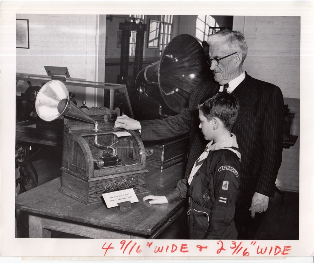 Museum staff member playing Edison Excelsior phonograph for cub scout at Edison Museum.