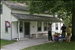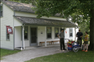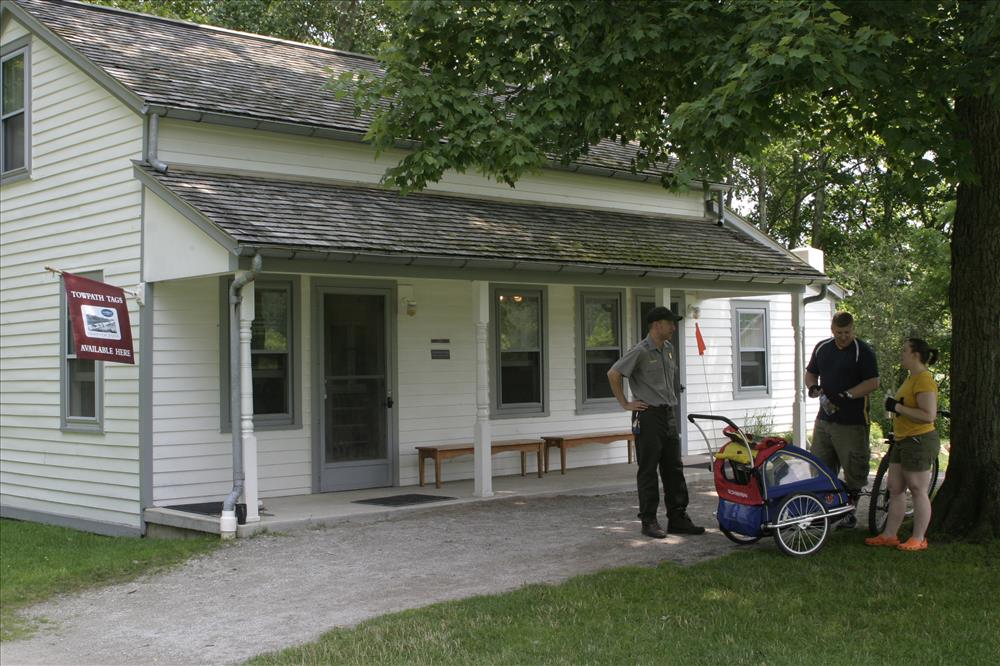 A park ranger talks to visitors outside of Hunt Farm Visitor Information Center. || Hunt Farm Visitor Information Center is a popular rest stop for people recreating on the Ohio & Erie Canal Towpath Trail. It has exhibits highlighting agricultural history and recreational opportunities in the valley.