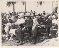 Harvey Firestone, Mina Edison, Thomas Edison, and Henry Ford at Fort Myers city park on Edison's 83rd birthday.
