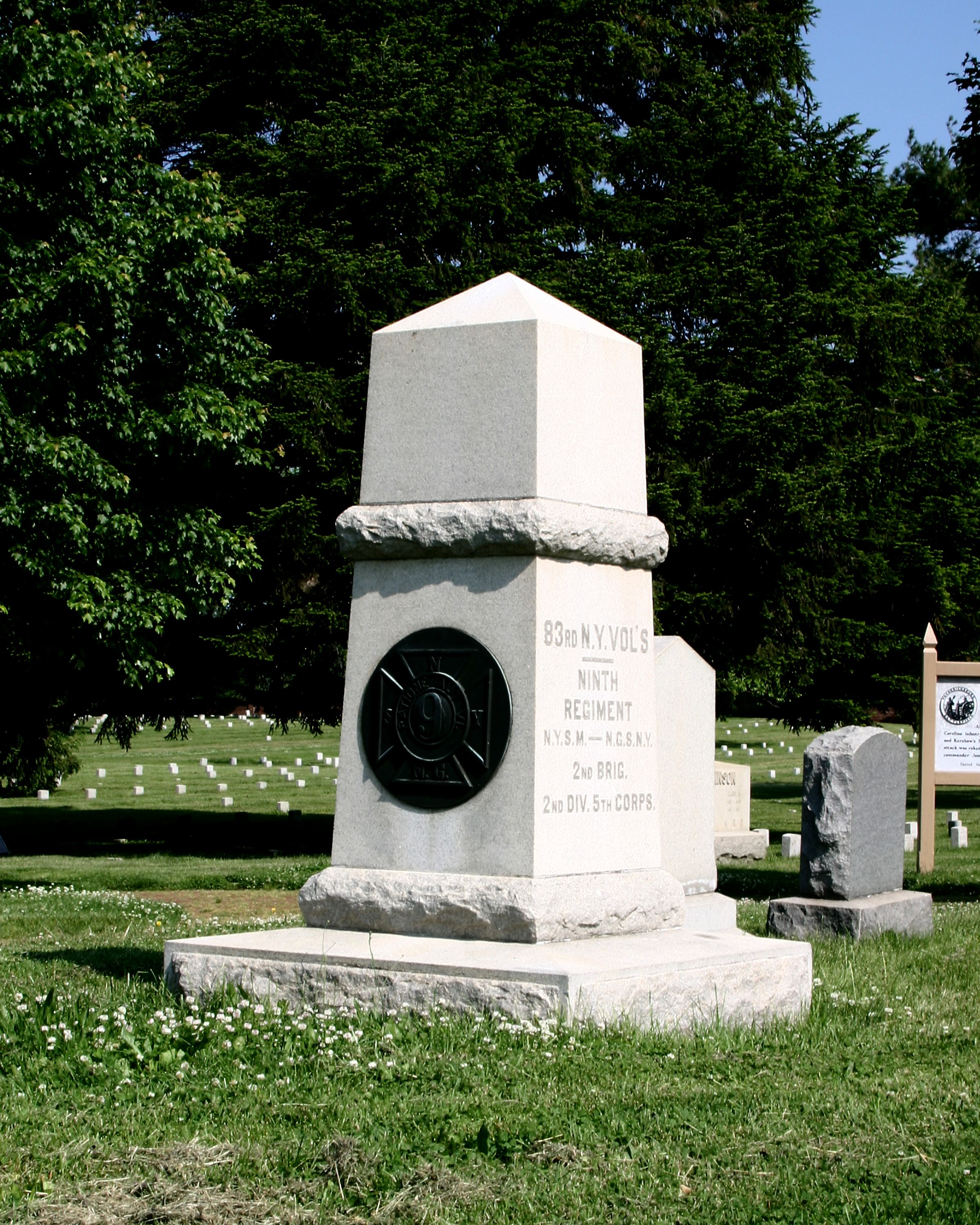 Erected by surviving comrades of the 83rd New York Volunteers to the memory of those fallen and to their Colonel, Joseph Moesch, on whose grave this monument rests. Moesch died in battle during the Wilderness campaign. || 6'H Mn in National Cemetery w/ 48"Lx48"Wx9"H rough-cut, tooled edge base, monlithic shaft tapering to pyramidal top w/ rough-cut banding. Polished faces w/ raised lettering. Circular bronze plaque at W w/ Regiment & Corps insignia.