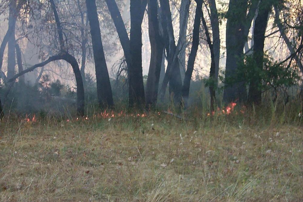 Fire crew members using drip torches to ignite El Capitan prescribed burn, 2000, Yosemite National Park.