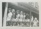 Seven nurses pose on a porch railing, also two unidentified males in the shot