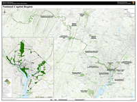 Map of the National Parks in the National Capital Region, National Park Service, U.S. Department of the Interior located in the District of Columbia, Maryland, Virginia, and West Virginia. The main map provides an overview of the administrative units: Antietam National Battlefield, Catoctin Mountain Park, Chesapeake and Ohio Canal National Historical Park, George Washington Memorial Parkway, Harpers Ferry National Historical Park, Manassas National Battlefield Park, Monocacy National Battlefield, National Capital Parks-East, Greenbelt Park and Baltimore-Washington Parkway, Fort Washington and Piscataway Parks, National Mall and Memorial Parks, President’s Park (White House), Prince William Forest Park, Rock Creek Park, and Wolf Trap National Park for the Performing Arts. The inset map shows a more detailed view of the District of Columbia and the approximate division of National Park administration within that area. Both the main map and inset map use the Esri World Topographic basemap and are oriented with