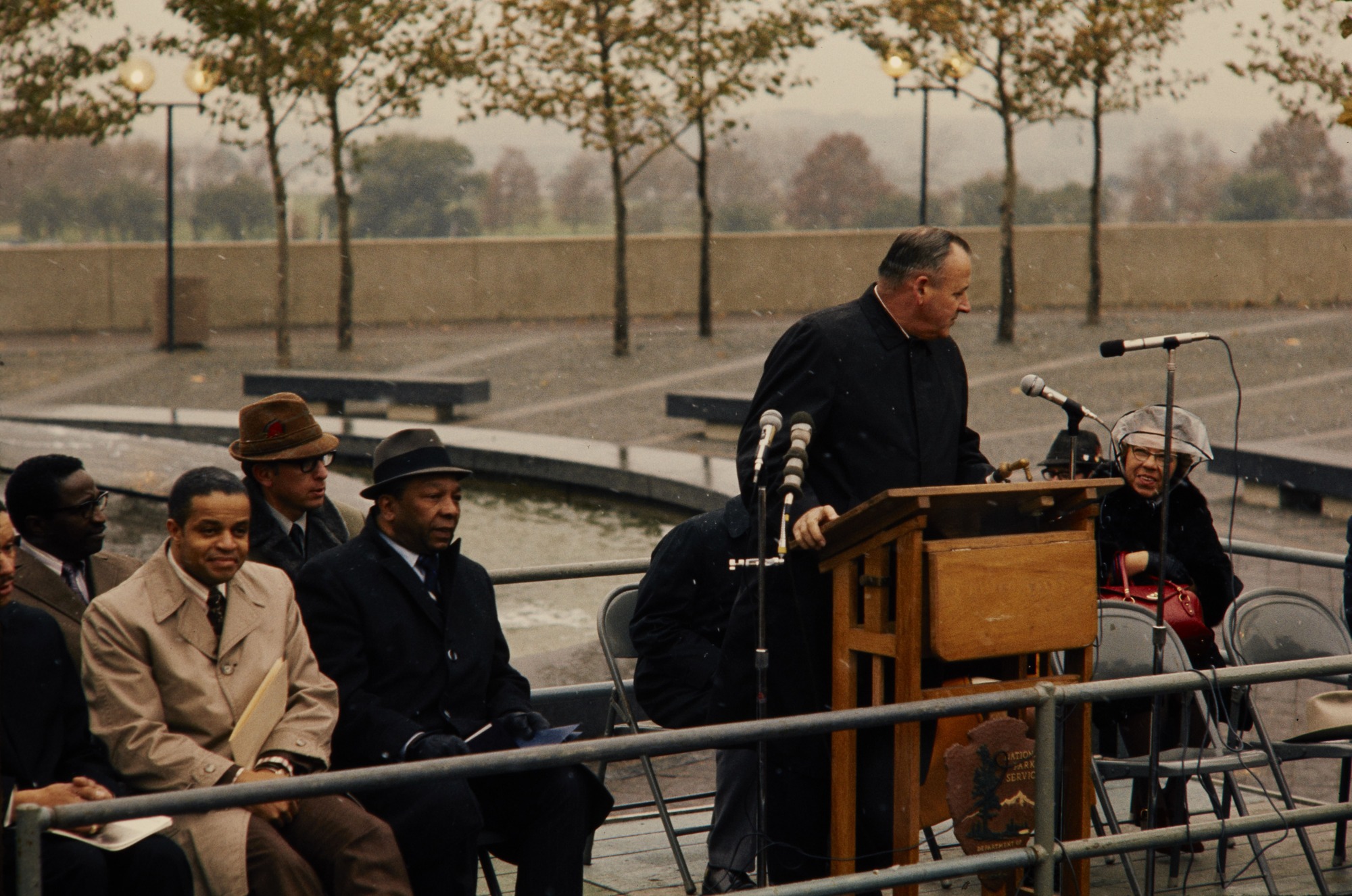 NPS Director George B. Hartzog, Jr. talking on a stage at Banneker Park in National Mall and Memorial Parks.