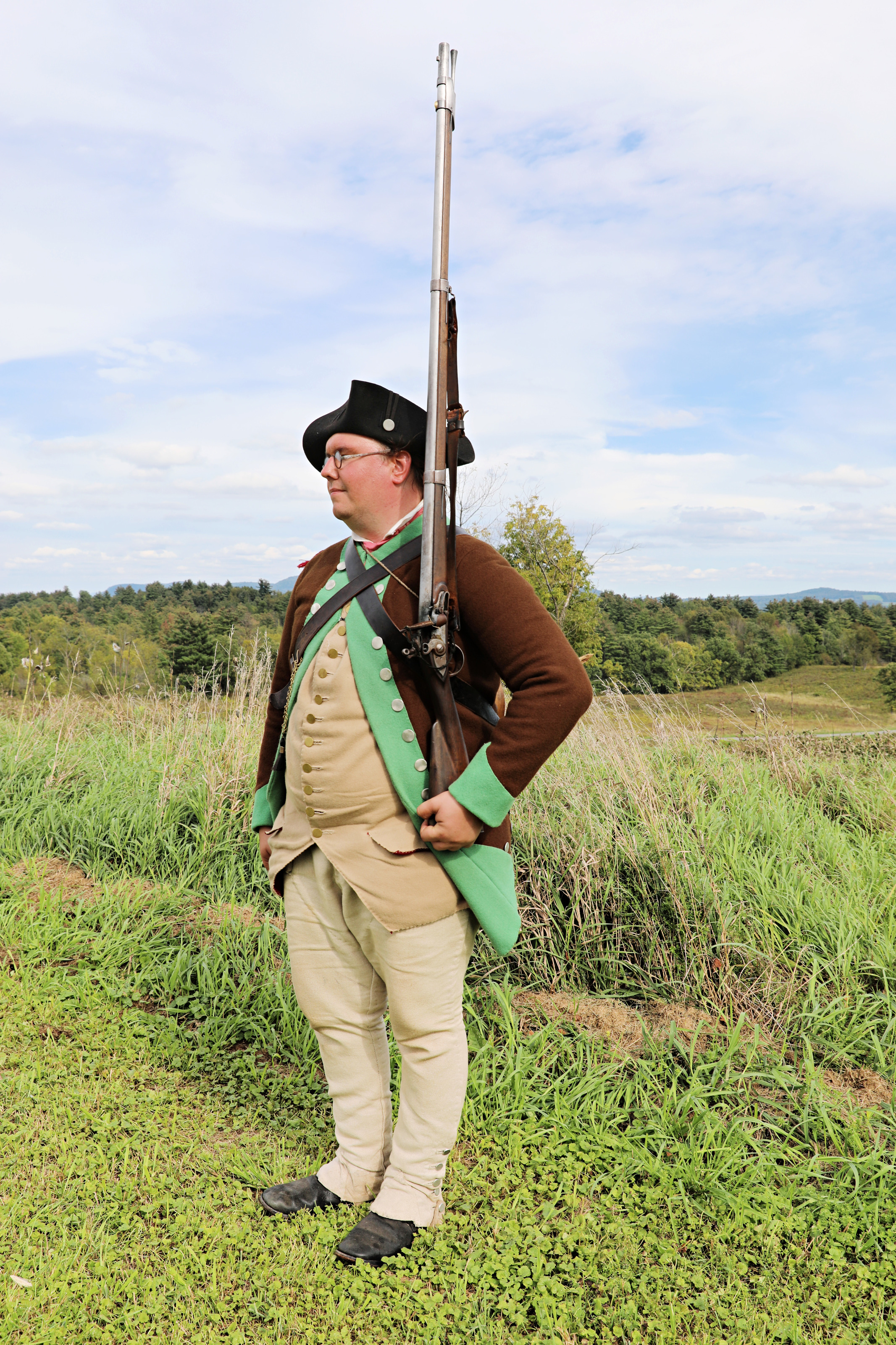 A man in a black hat, green and brown jacket, tan top and pants with black shoes holds a musket at his side.