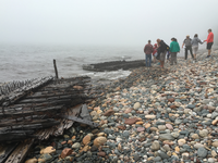 Park ranger and group of people on a rocky Lake Superior beach looking at wooden parts of old ships that washed ashore. The ship pieces are made up of wooden boards, metal straps, and metal studs. It's a foggy day.