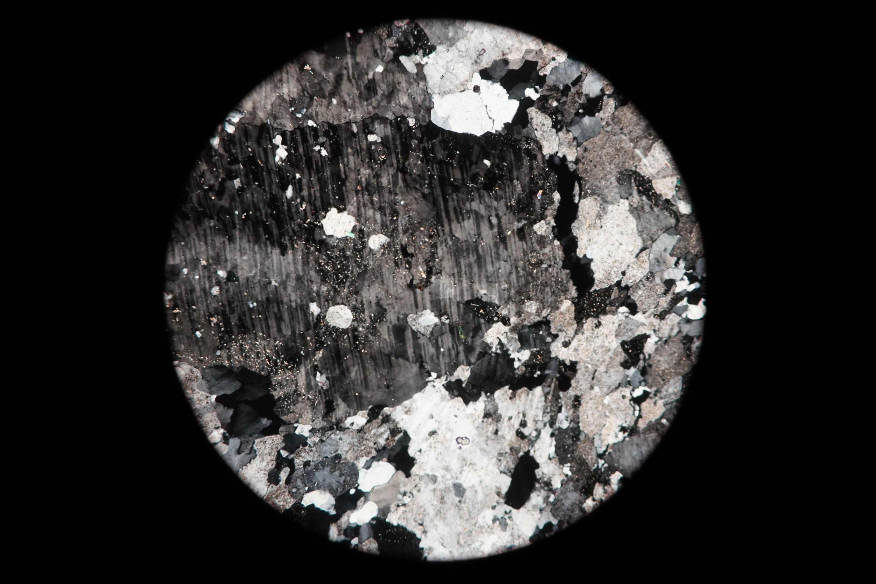 Microscopic image of a thin section of gneiss collected by Peter Misch near Bacon Creek in 1961. One of six images. (Peter Misch Geology Collection, North Cascades NPS Complex Museum Collection.)