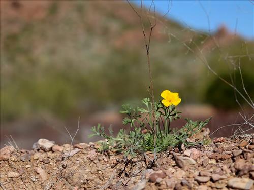 Lone wildflower blooming on the desert landscape, Oregon Pipe Cactus National Monument, 2015.